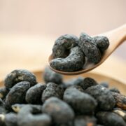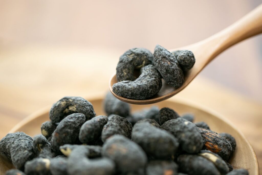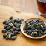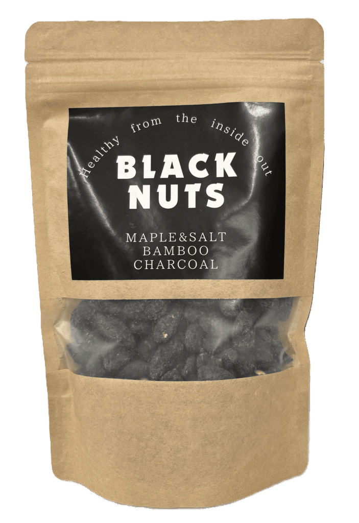 竹の間伐材からできた食用炭を絡めたナッツ。見た目のインパクトと、自然な甘さで森を守るおいしい新習慣です。