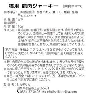 山梨県産鹿肉、紀州産梅酢エキス、国産煮干し、国産鰹節、北海道産昆布、国産干しシイタケ