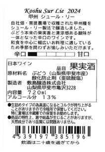 甲州種を使用しシュール・リー製法(澱の上で熟成)で醸造。果実香と清涼感ある酸味が一体となった、辛口のワイン。