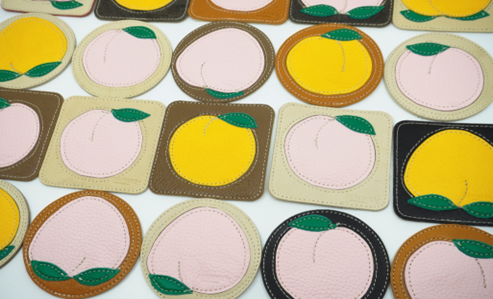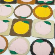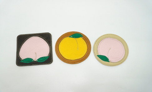 鞄やベルトを作る時に出る端材や傷があり商品には向かない部分を使いパッチワークで桃の形にしてみました。