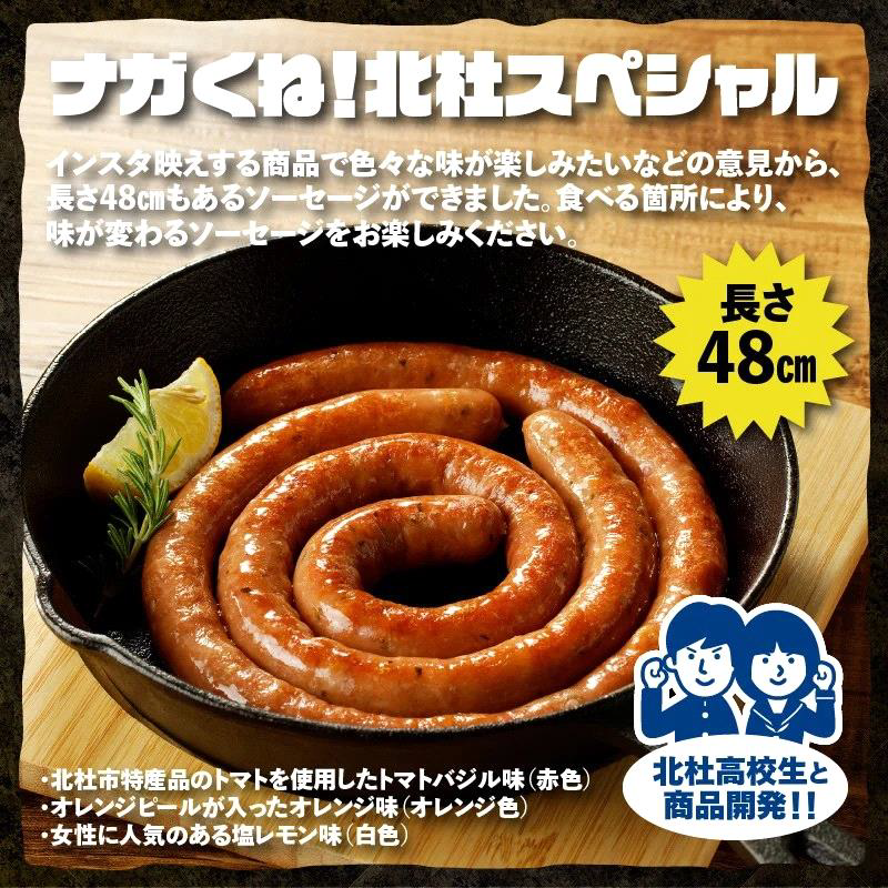 食べる箇所により味が変化する、48cmもある3種類(トマトチーズ・レモンバジル・オレンジ)のマーブルソーセージ。